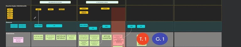 En esta primera sesión, ya teníamos preparado el listado de los cinco casos de uso. Como siempre, analizamos el ecosistema de usuarios y sistemas que componen el proceso completo. De esta manera, empezamos a desplegar las piezas del puzzle visual que utilizamos para documentar cada paso.