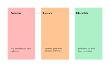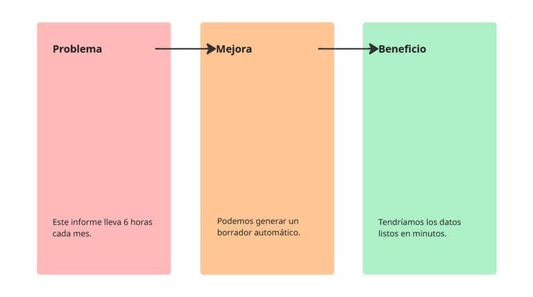 Teniendo claro el proceso y quiénes intervienen, tendrás mucho más fácil la identificación de mejoras. Lo importante es enfocarte en beneficios concretos, no en tecnología.